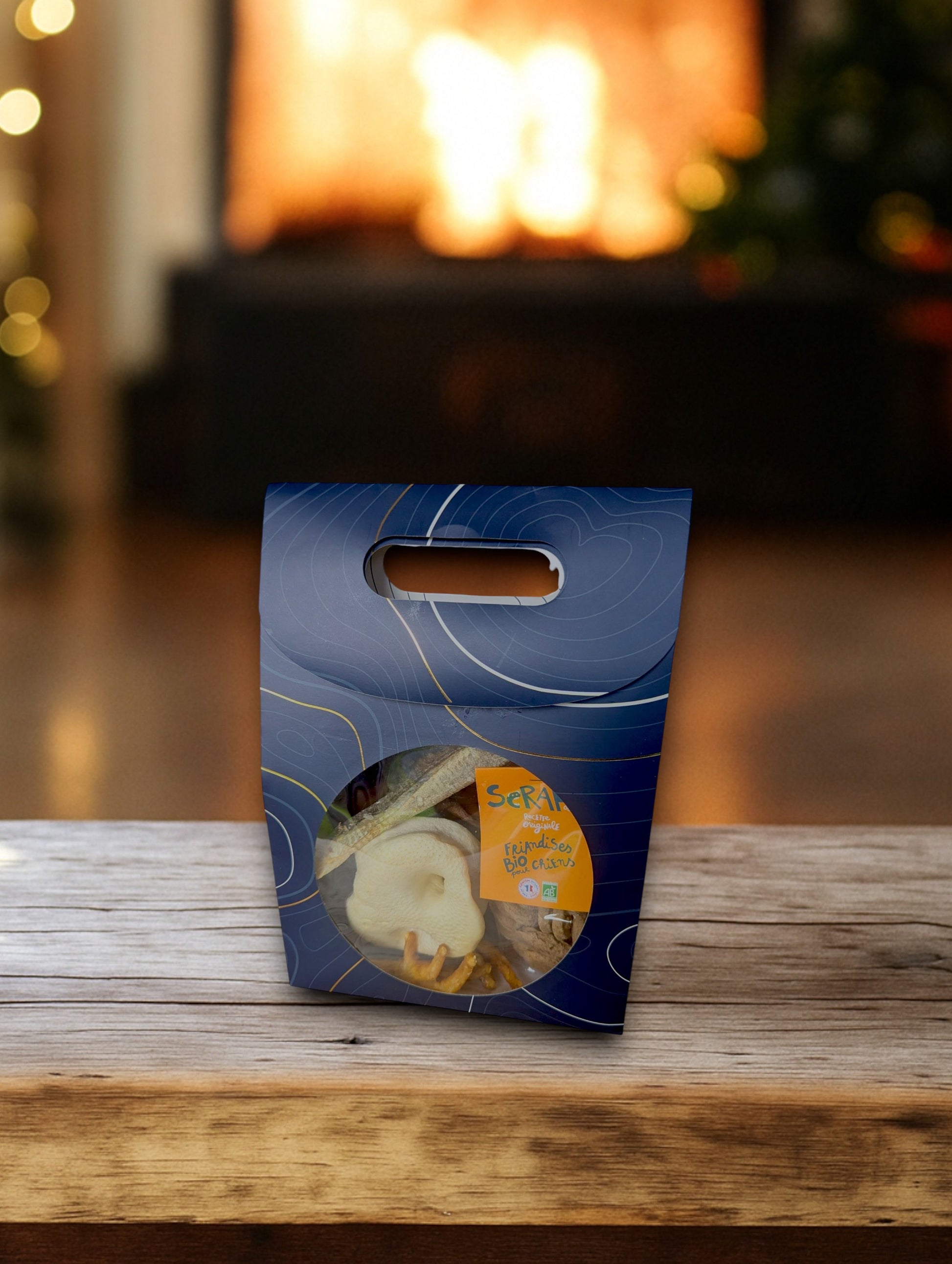 Offrez un vrai moment de fête à votre compagnon ! Édition Bleu Sapin est notre paquet de Noël, noué d’un ruban de saison, garni de friandises naturelles soigneusement sélectionnées. Une idée cadeau simple, jolie, et surtout… délicieuse. Disponible uniquement pendant la période de Noël.